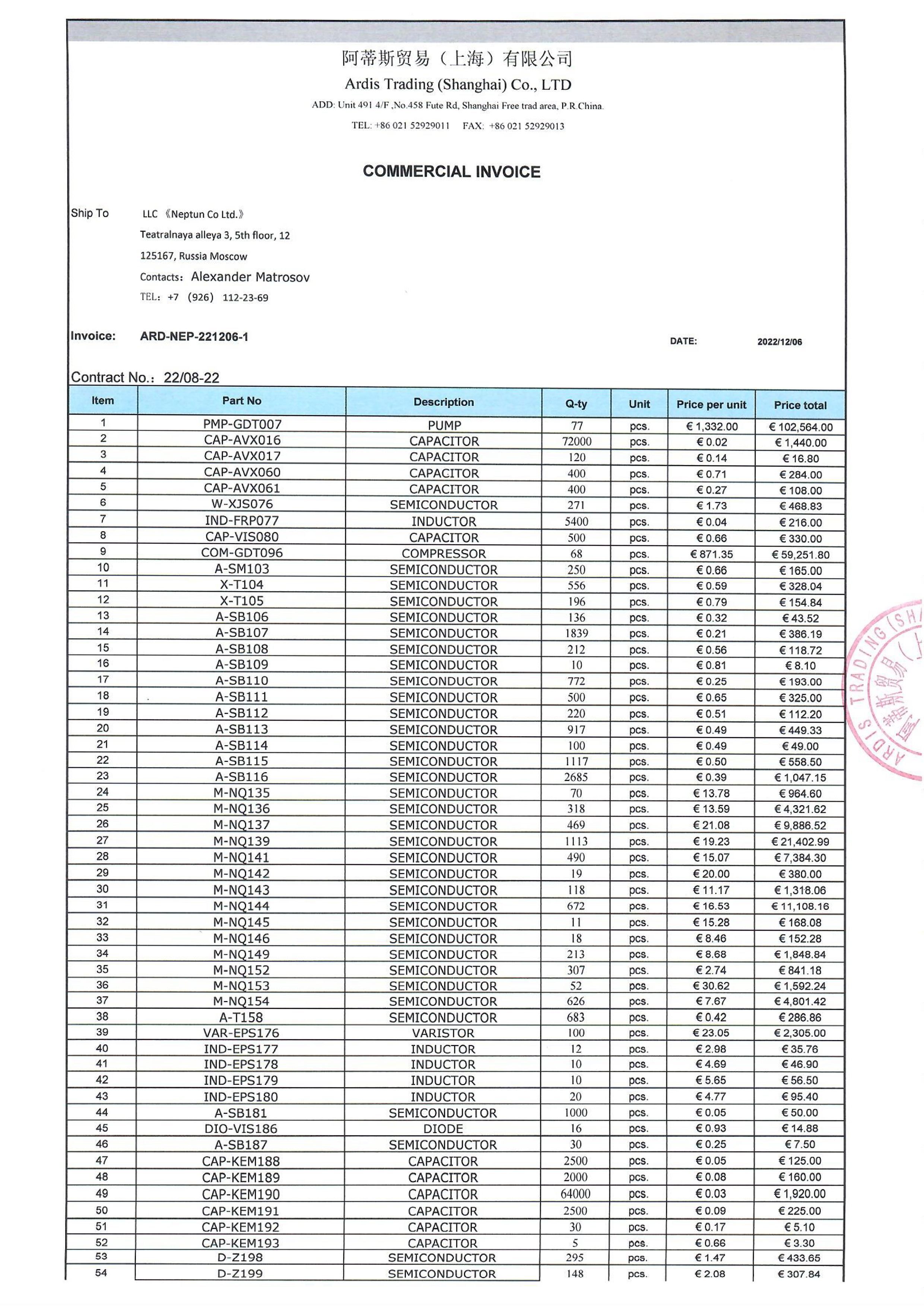 In recent years, Neptun has specialised in procuring microelectronics and laboratory equipment through countries in Southeast Asia and the Far East. For instance, during the first year of the full-scale war in Ukraine, Matrosov obtained more than 500,000 euros worth of critically important semiconductors and other components for Russia’s military-industrial complex through the Chinese supplier Ardis Trading (see the invoice on p. 51).